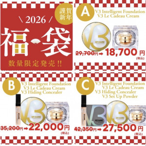 数量限定で最大14,850円引き!V3シリーズのお得な福袋を販売中です。 【Aセット】 V3インテリジェントファンデーション+V3ルカドクリーム 29,700円 → 18,700円 【Bセット】 V3インテリジェントファンデーション+V3ルカドクリーム +V3ハイディングコンシーラー 35,200円 → 22,000円 【Cセット】 V3インテリジェントファンデーション+V3ルカドクリーム +V3ハイディングコンシーラー+V3セットアップパウダー 42,350円 → 27,500円 V3インテリジェントファンデーションは、シリーズ最大の カバー力と紫外線カット力を備え、SPF50・PA++++。 セミマットな仕上がりで、混合肌の方や年齢による お肌の悩みが気になる方におすすめです。 2種類のHARIを配合し、日中も肌ケアが叶います。 V3ルカドクリームは、2種の美容針を配合したこっくりと したテクスチャーのクリーム。 ハリとツヤのあるみずみずしい肌へ導き、エイジングケア にも最適です。 フローラルムスクの香りで、寝る前にリラックスできます。 イノスピキュールとグロウスピキュールの2つのHARIで、 日中も寝ている間もエイジングケアができるV3福袋。 なくなり次第終了となりますので、お早めにお買い求め くださいませ。